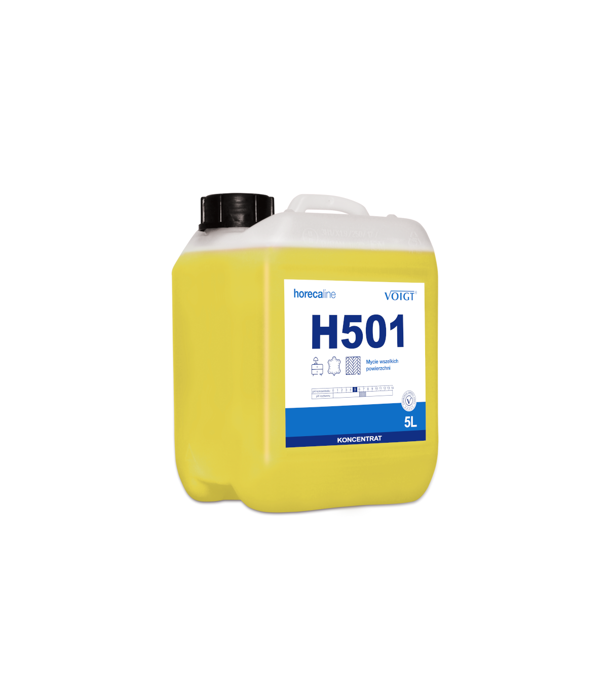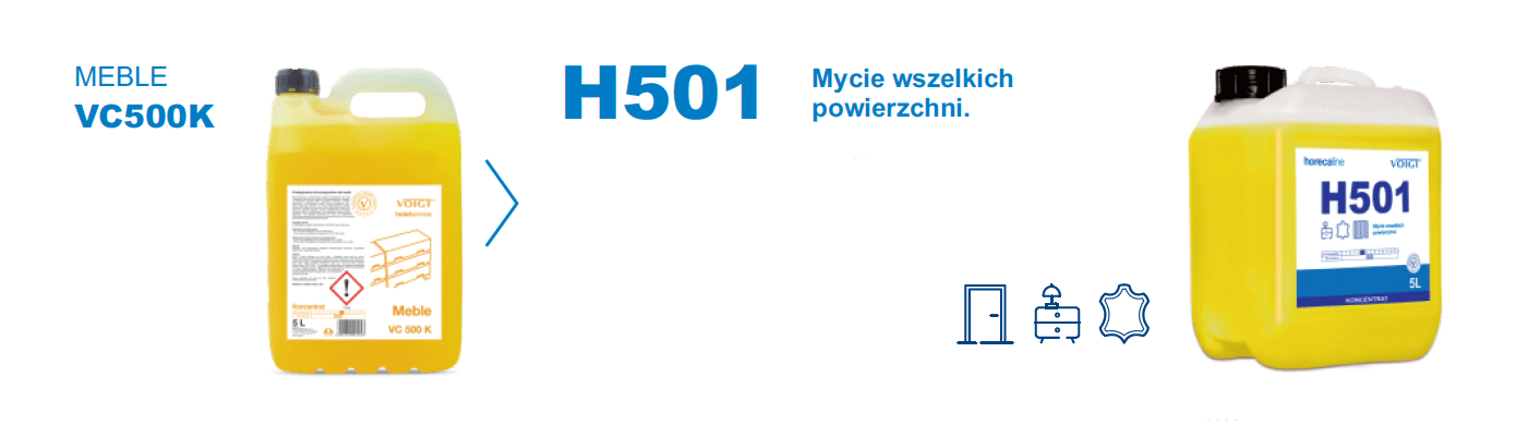 H501 to nowy preparat z profesjonalnej linii HORECA marki VOIGT przygotowany specjalnie do profesjonalnego użytku w branżach gastronomicznych i hotelarskich. Produkt H501 zastępuje bezpośrednio znany skoncentrowany środek VC 500K MEBLE. Ulepszona formuła oraz zmieniony zapach czyni preparat jeszcze bardziej uniwersalnym i skutecznym. Świetnie sprawdzi się do bieżącego mycia i pielęgnacji mebli, drewnianych podłóg lakierowanych i olejowanych, laminatów, paneli, elementów plastikowych, skórzanych i wszelkich wodoodpornych powierzchni ponadpodłogowych, zarówno matowych jak i z połyskiem. Usuwa brud, kurz, tłuste zabrudzenia przywracając powierzchnią naturalny blask.