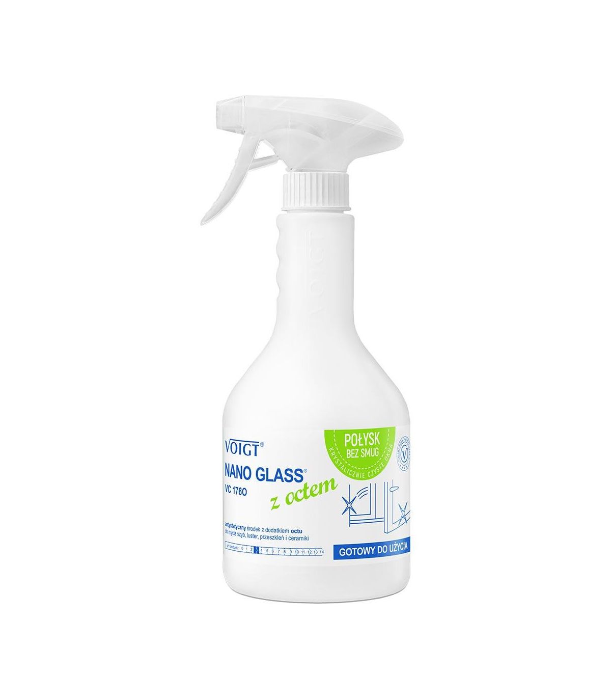 VC176O NANO GLASS Z OCTEM marki VOIGT to nowoczesny, gotowy do użycia antystatyczny spray z dodatkiem octu do mycia szyb, luster, przeszkleń i ceramiki. Dzięki zawartości octu skutecznie usuwa zabrudzenia pozostawiając krystaliczny blask mytych powierzchni bez smug. Zastosowana nanotechnologia działa antystatycznie, opóźnia odkładanie się brudu i ułatwia ponowne mycie. Nie wymaga polerowania i wycierania do sucha.