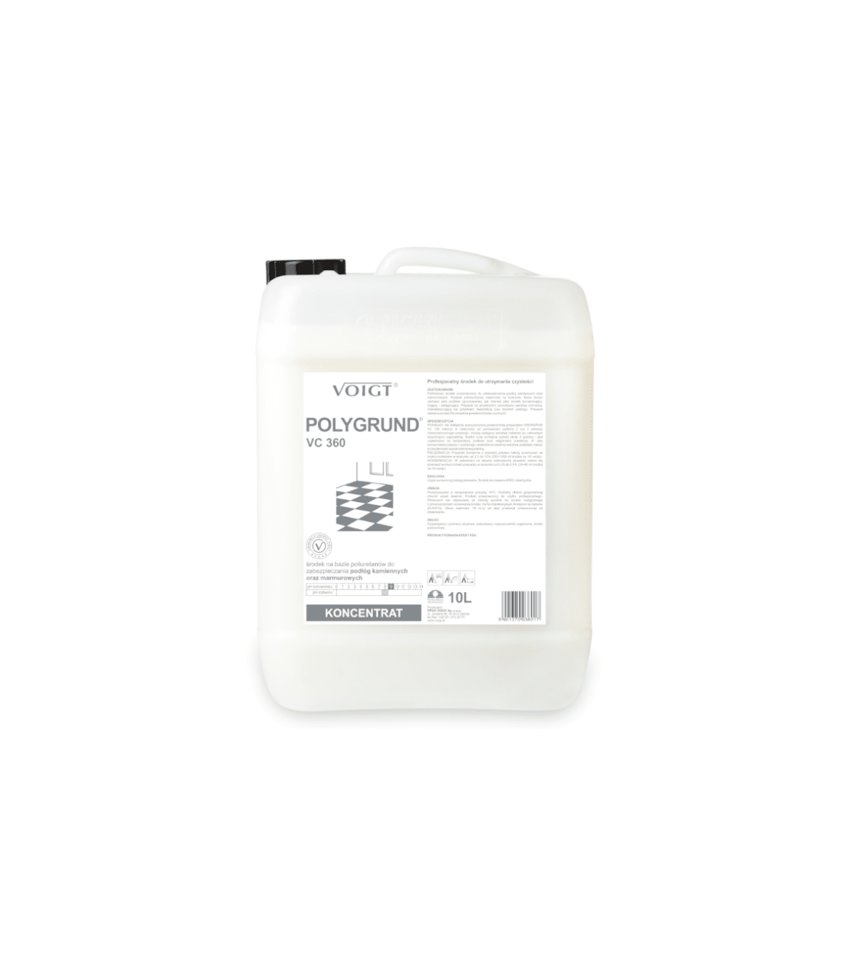 VC 360 POLYGRUND marki VOIGT to emulsja na bazie poliuretanów do zabezpieczania podłóg kamiennych oraz marmurowych. Posiada podwyższoną odporność na ścieranie i zużycie. Może służyć zarówno jako podkład (gruntowanie), jak również jako środek konserwujący, myjący i pielęgnujący. Preparat na powierzchni pozostawia warstwę ochronną, charakteryzującą się połyskiem, twardością oraz brakiem poślizgu. Preparat zawiera poniżej 5% związków powierzchniowo czynnych.