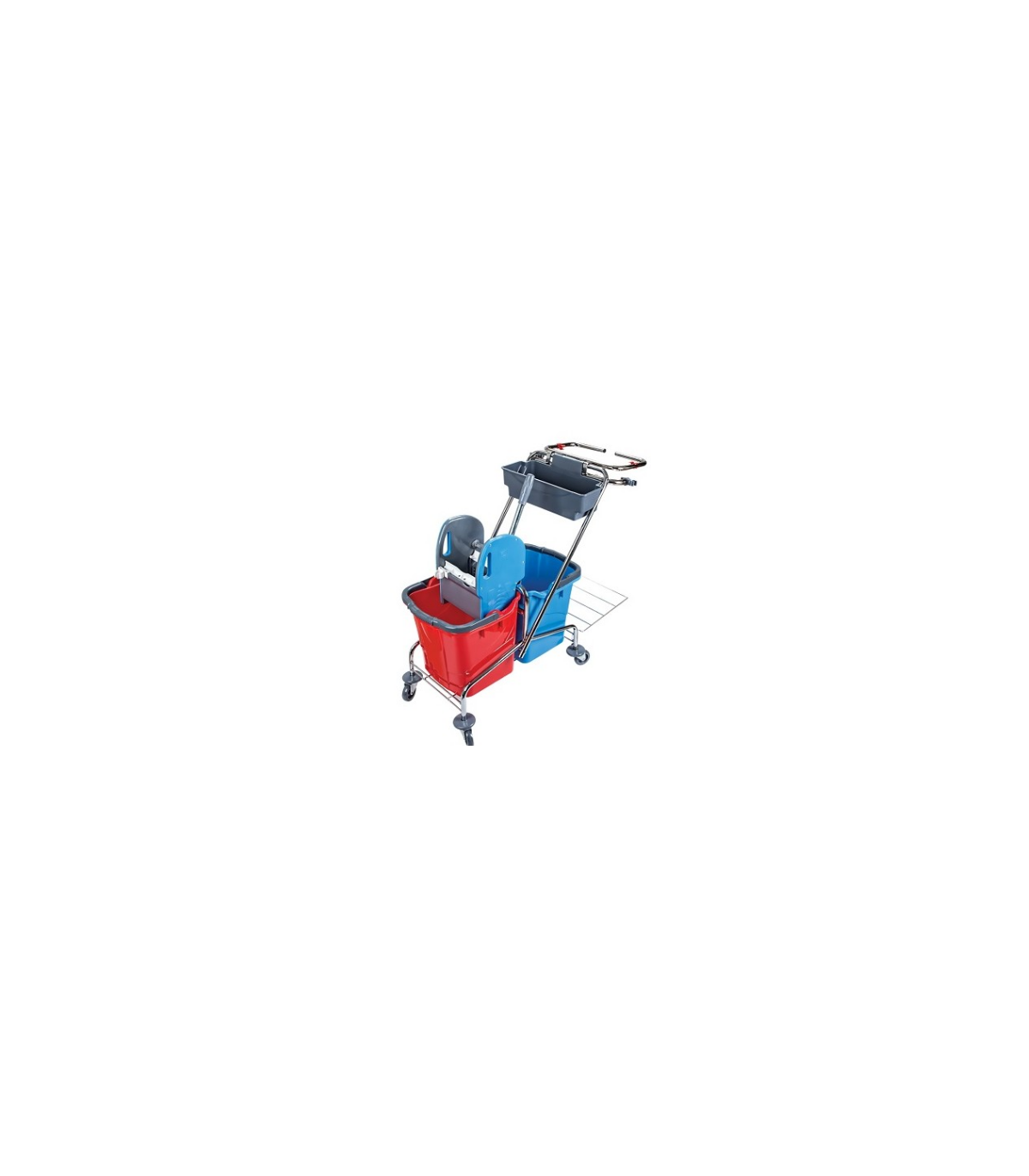 Profesjonalny wózek sprzątający wyposażony dwa oddzielne wiadra na czystą i brudną wodę. Podstawę konstrukcji wózka stanowi odporny, metalowy chromowany stelaż. Dwa duże wiadra o łącznej pojemności ponad 30 litrów pozwalają na efektywne mycie podłóg bez konieczności częstej wymiany wody. Uniwersalna szczękowa prasa z antypoślizgowym uchwytem dołączona do wózka pozwala na dokładne odciśnięcie każdego rodzaju mopa. Nierysujące gumowe i w pełni skrętne kółka z osłonkami zapewniają łatwość prowadzenia zestawu. Metalowy koszyk pozwala na wygodne przewożenie drobnego ręcznego sprzętu lub środków czystości. Konstrukcje uzupełnia w pełni demontowalny stelaż z podstawką na duży worek na śmieci o pojemności 120 litrów. Wysoka jakość wykonania i prosta konstrukcja pozwala na bezproblemową i wieloletnią eksploatacje. Zestaw sprzątający świetnie sprawdzi się do utrzymania czystości w szkołach, przedszkolach, biurach, sklepach czy placówkach służby zdrowia.