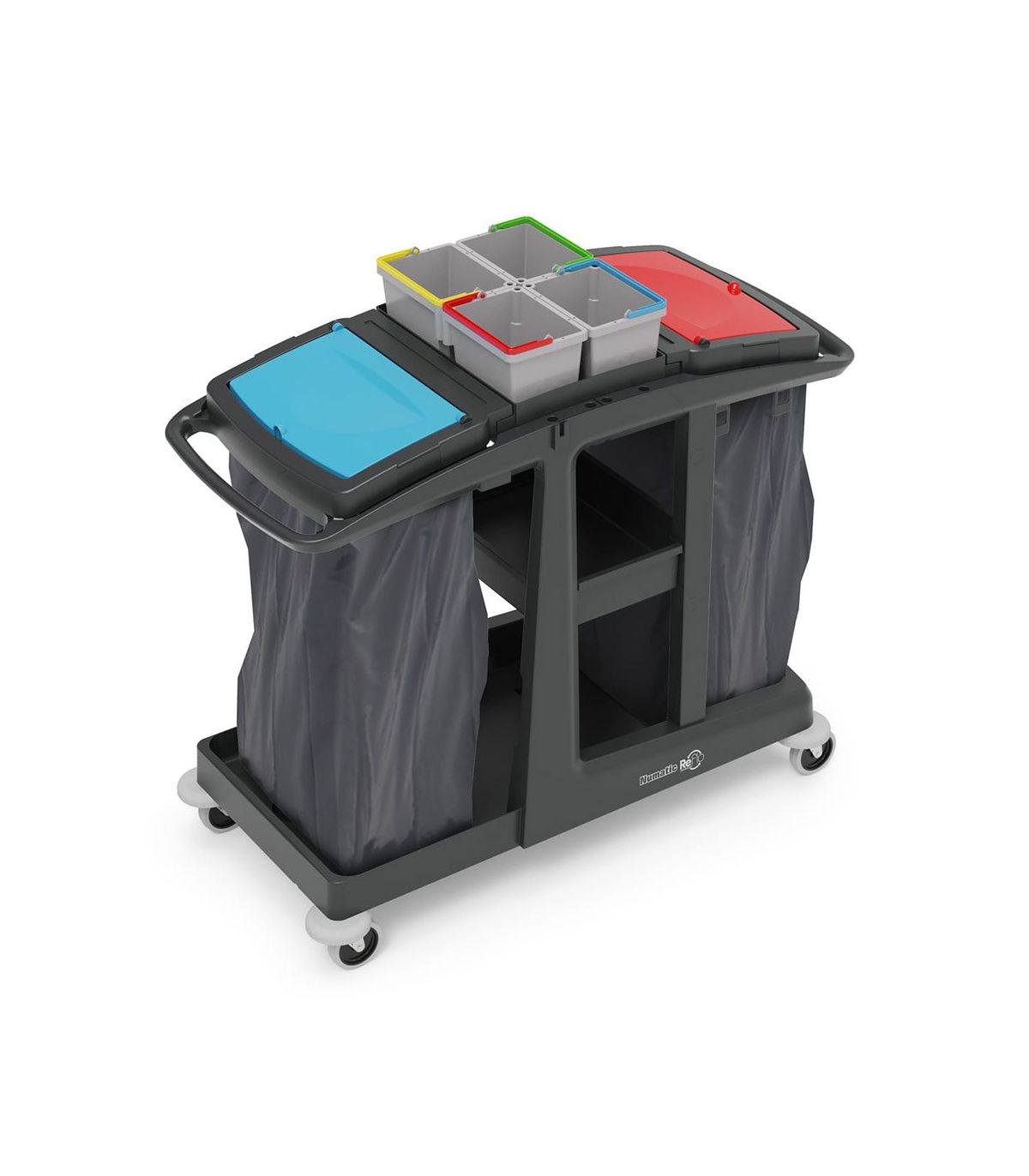 Model ECO-MATIC EM 4 został wyposażony w dwa boczne stelaże z klapą do segregacji odpadów z możliwością rozdzielenia koszy w systemie 4x 60 litrów lub 2x 120 litrów. Wózek został doposażony w zestaw czterech górnych wiaderek z kolorystycznie oznaczonymi rączkami do przewożenia środków czystości lub akcesoriów do sprzątania. Całość konstrukcji osadzono na kompaktowej i zwrotnej, nieco ponad metrowej platformie z czterema wytrzymałymi kołami o średnicy 100mm.