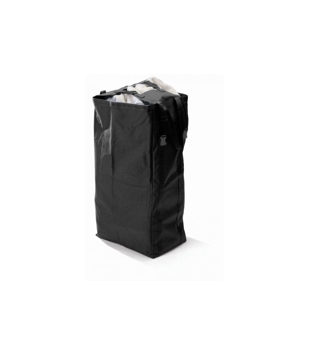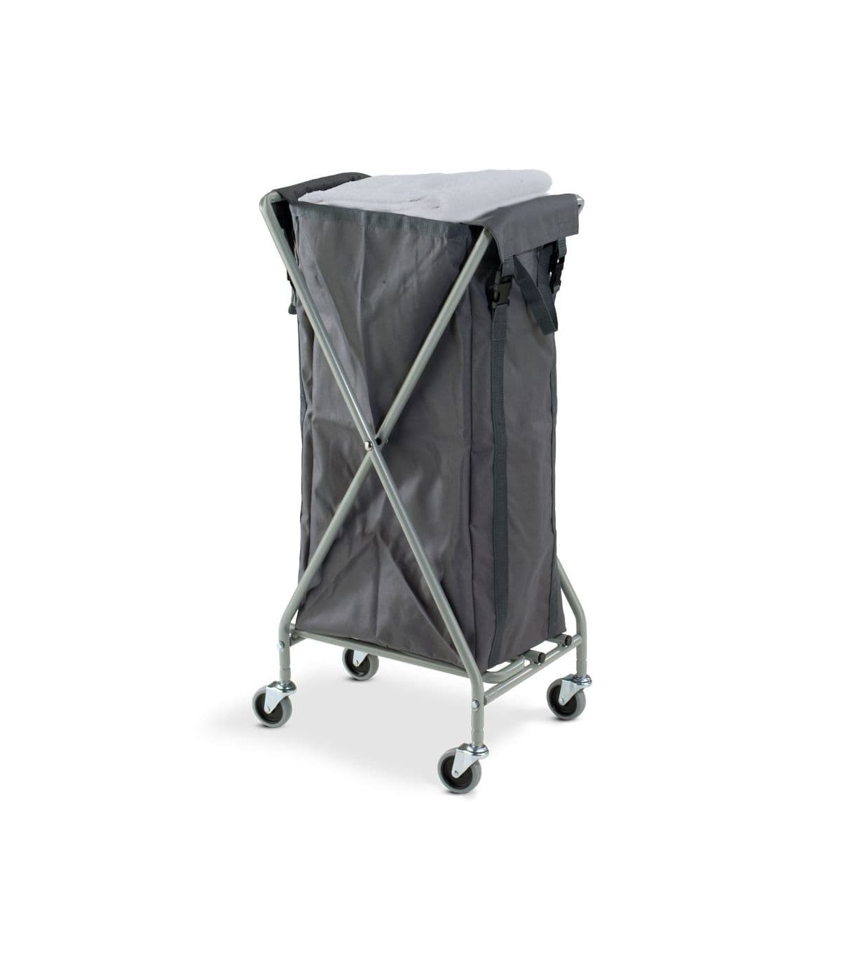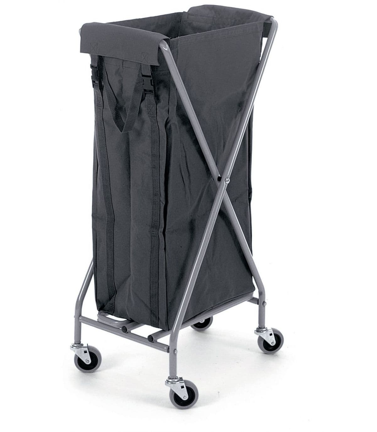 Składany wózek hotelowy na pościel. Zbudowany na solidnej i sztywnej ramy ze stali lakierowanej proszkowo z czterema kołami skrętnymi dla maksymalnej zwrotności. Składana rama wózka pozwala na sprawny transport oraz magazynowanie. Gumowane koła na łożyskach kulkowych/ślizgowych zapewniają ciche przemieszczanie wózka. Model został wyposażony w jeden brezentowy wyjmowalny worek o pojemności 100L, który ułatwia transport pościeli.