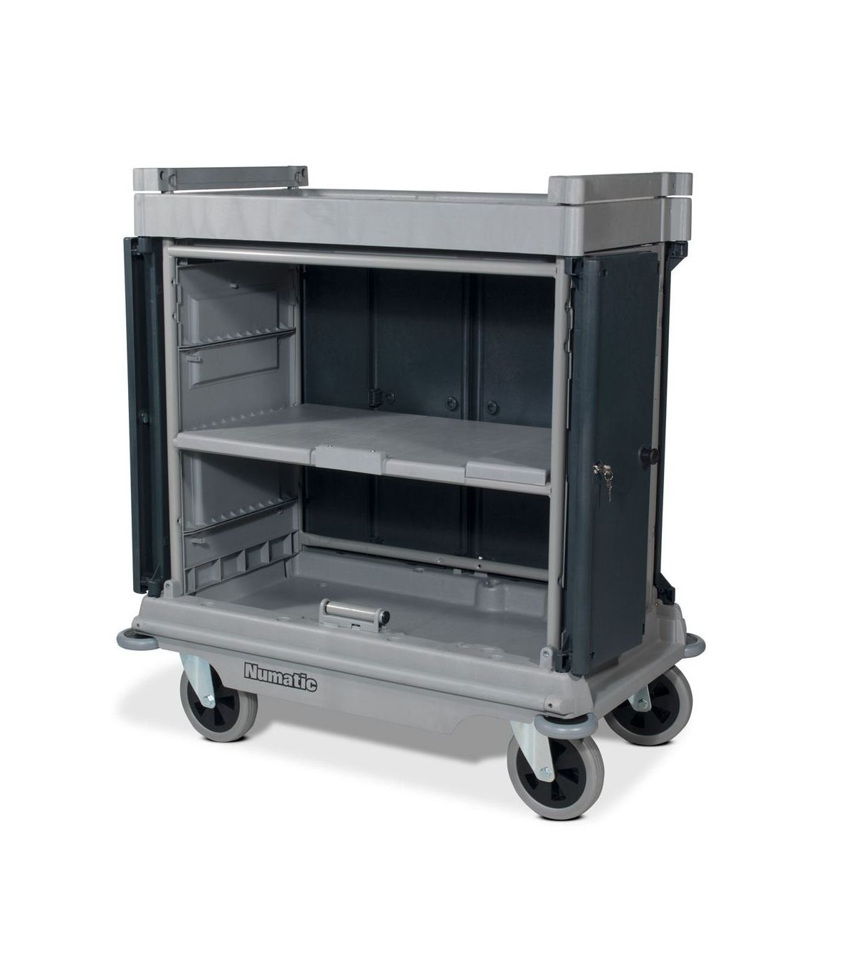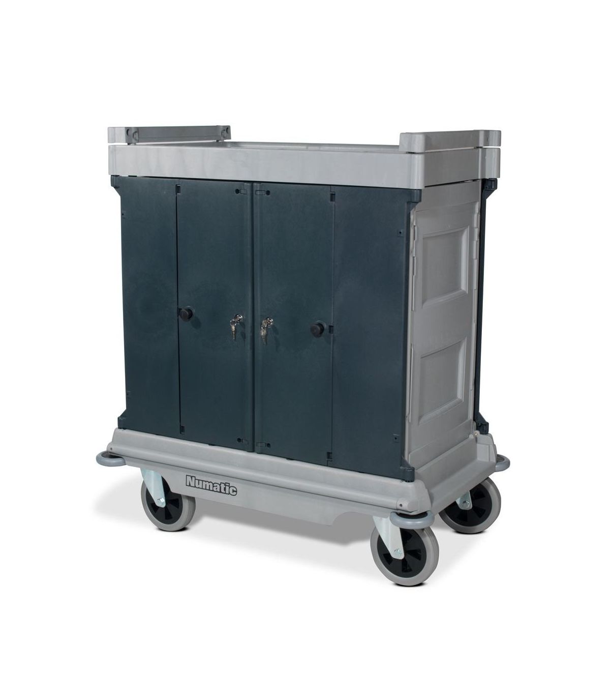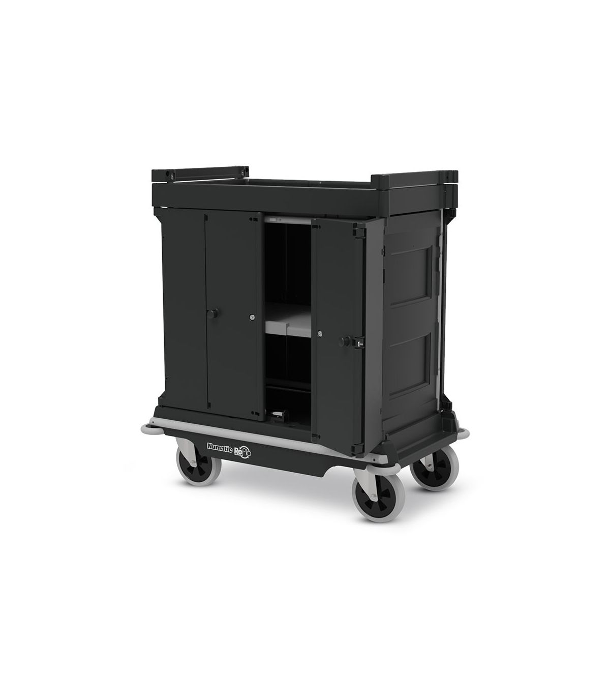 NKU 30 RHF NuKeeper angielskiej marki Numatic to duży wielofunkcyjny wózek hotelowy przeznaczony do przewożenia bielizny hotelowej oraz wszelkiego wyposażenia hotelowego. Model z serii NKU wyposażony został w dwie duże półki zamykane drzwiczkami z tworzywa oraz jedną górną zewnętrzną.