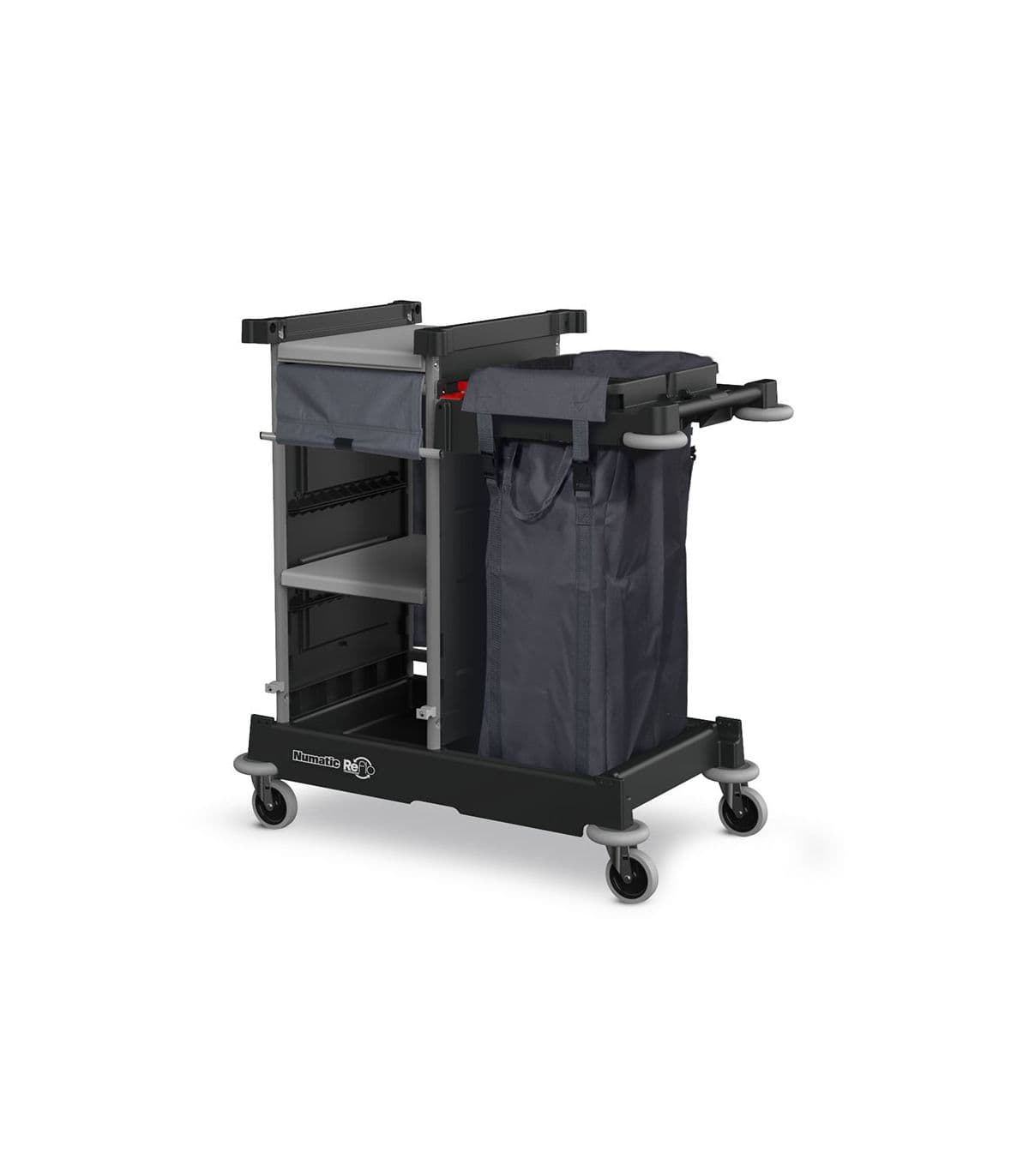 NKS 1 LLR Nu Keeper angielskiej marki Numatic to średniej wielkości wielofunkcyjny wózek hotelowy przeznaczony do przewożenia, wymiany i segregacji bielizny hotelowej oraz wszelkiego wyposażenia hotelowego. Wyposażony w dwie wewnętrzne i jedną zewnętrzną półkę oraz duży brezentowy worek o pojemności 100 litrów.